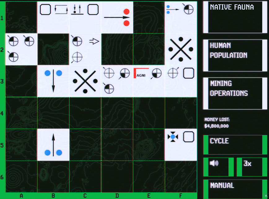 A truly fascinating and compelling puzzle game, extremely convoluted and unique. However, I've managed to emergently soft-lock the game. For ten cycles, the board has not moved, as all weather conditions keep themselves stagnant. No new weather gets added, presumably because there is too much on screen at once. I am at peace.